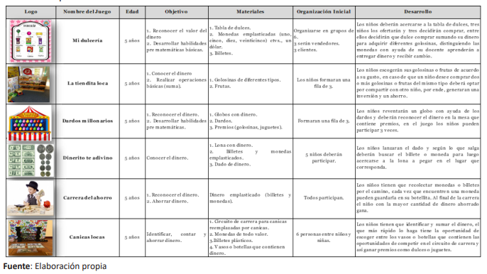 Canicas locas: Aplicar este juego fue de gran utilidad debido a que se presentó una serie de monedas y billetes, al lanzar la canica ellos podían elegir el dinero según el premio que deseaban, se llevaban el premio y si ellos querían, podían invertir el dinero en otro juguete o ahorrarlo para guardarlo en el chanchito ahorrador.